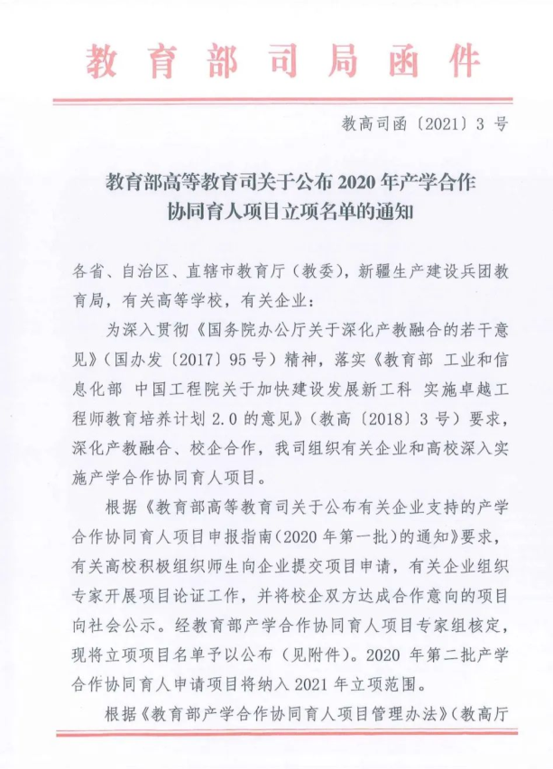 近日,教育部高等教育司公布了2020年教育部产学合作协同育人项目立项名单,我院获批一项。我院刘素红副教授的项目“混合式教学在《复变函数与积分变换》中的应用”获批,立项号:202002021014。