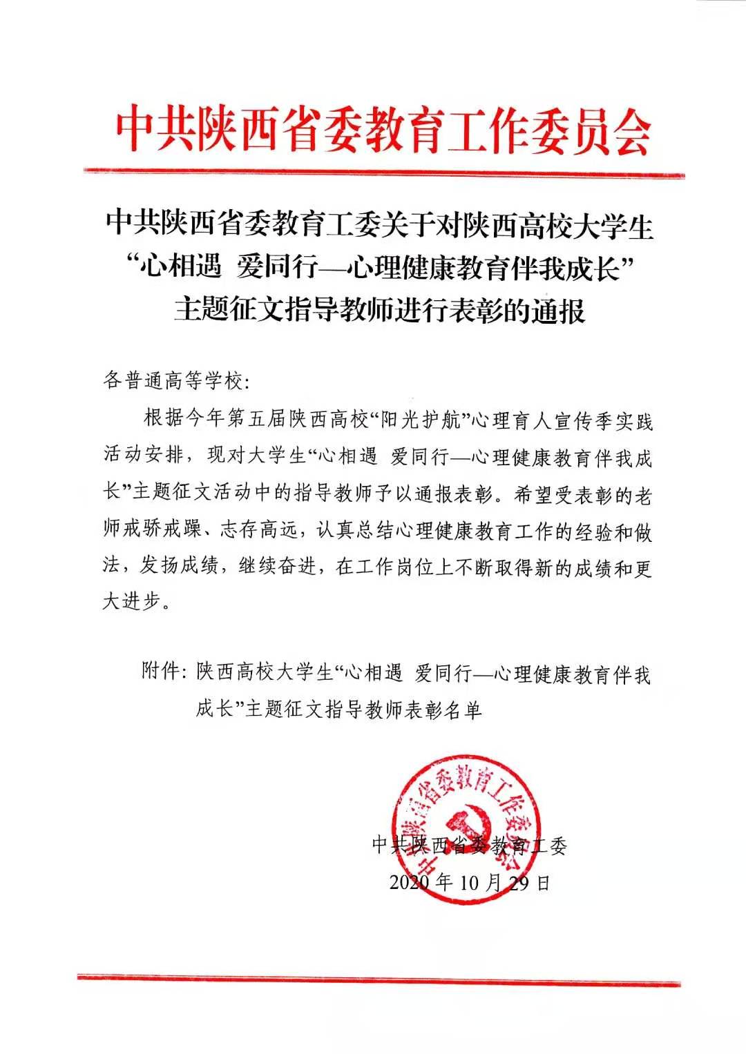 根据今年第五届陕西高校“阳光护航”心理育人宣传季实践活动安排,现对大学生“心相遇 爱同行—心理健康教育伴我成长”主题征文活动中的教师予以通报表彰。