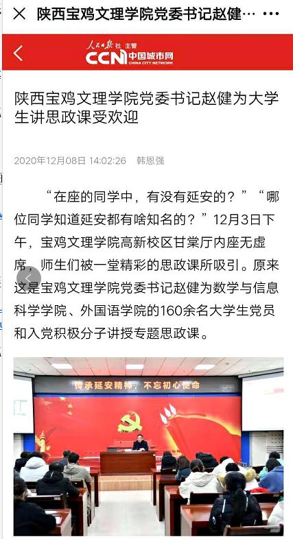 近日,我校党委书记赵健为大学生讲思政课、举办高等教育学会2020年会暨陕西高等教育论坛、举行消防灭火暨紧急疏散演练等活动引起人民日报新媒体、央视新闻移动网、学习强国、今日头条、文化艺术报等多家媒体的广泛关注和报道。