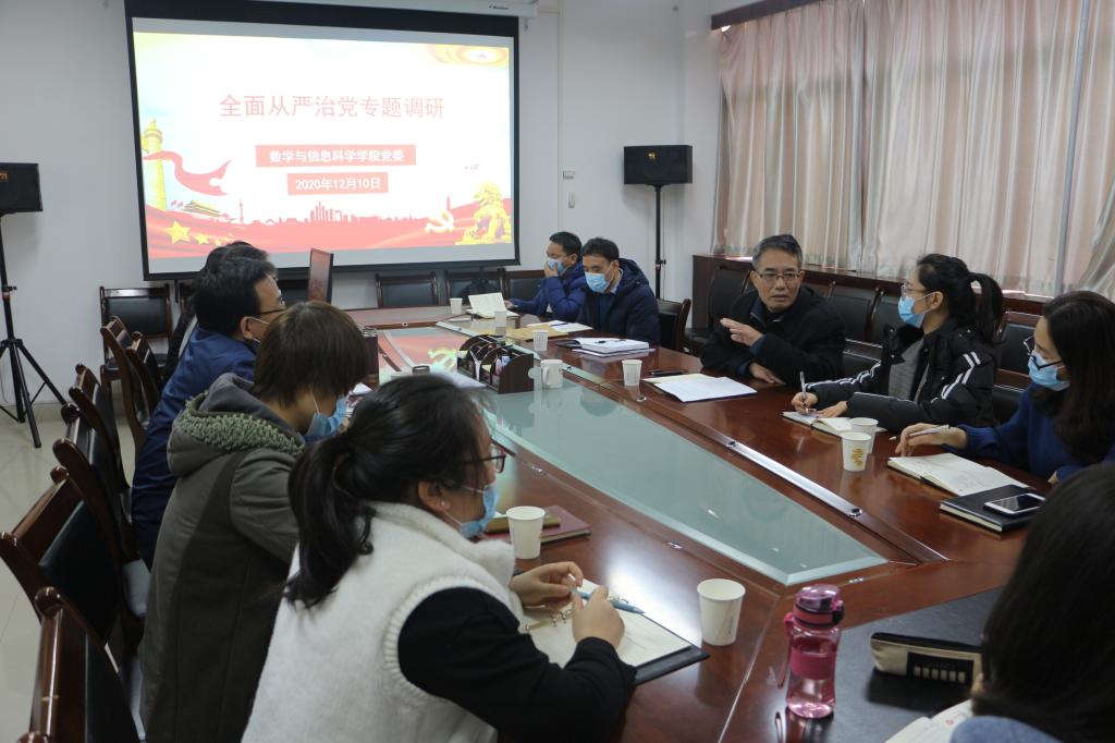 12月10日上午,校党委书记赵健在数学与信息科学学院会议室开展全面从严治党专题调研,校党委组织部部长、学院党政领导、党委委员、支部书记、教师和学生党员代表参加了此次调研。