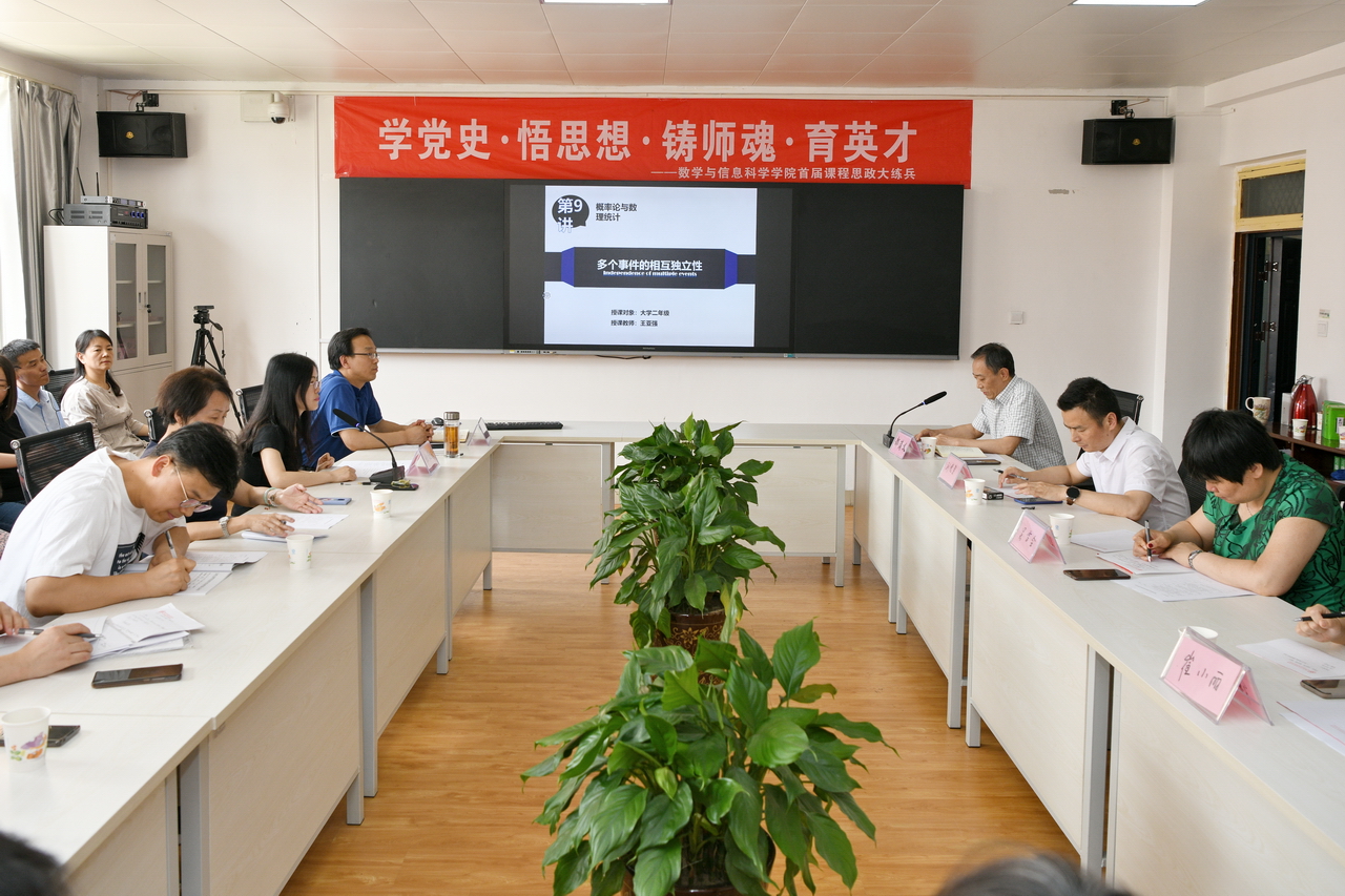 为深入贯彻落实习近平总书记在党史学习教育动员大会上的重要讲话精神,用习近平新时代中国特色社会主义思想铸魂育人,高质量做好新时代学校课程思政建设,2021年5月26日,数学与信息科学学院在思贤楼424会议室举办了“学党史、悟思想、铸师魂、育英才”系列活动一:首届课程思政大练兵讲课竞赛。比赛由数学与信息科学学院副院长杜红珍主持。