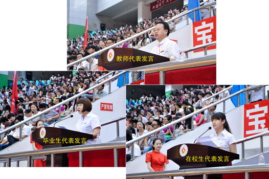 文学与新闻传播学院教授张乃良代表全体教师对毕业生圆满完成学业表示衷心祝贺,他与学生们分享了作为文理人对大学的体悟和理解,并对毕业生们的未来寄予了美好的期望。外国语言文学系毕业生代表刘潇匀代表全体毕业生向辛勤培养他们的老师表示诚挚的谢意,表示无论身在何处,都会永远铭记母校“博文明理、厚德尚能”的校训,永远不会忘记母校老师的谆谆教诲,志存高远,脚踏实地,在实现中华民族伟大复兴之中国梦的实践中放飞青春的梦想。经济管理系2010级王倩代表全体在校生衷心祝愿全体毕业生一帆风顺,生活幸福,事业有成,表示一定会像他们一样认真踏实、勤勉刻苦,以优异成绩和实际行动为母校的发展贡献自己的力量!