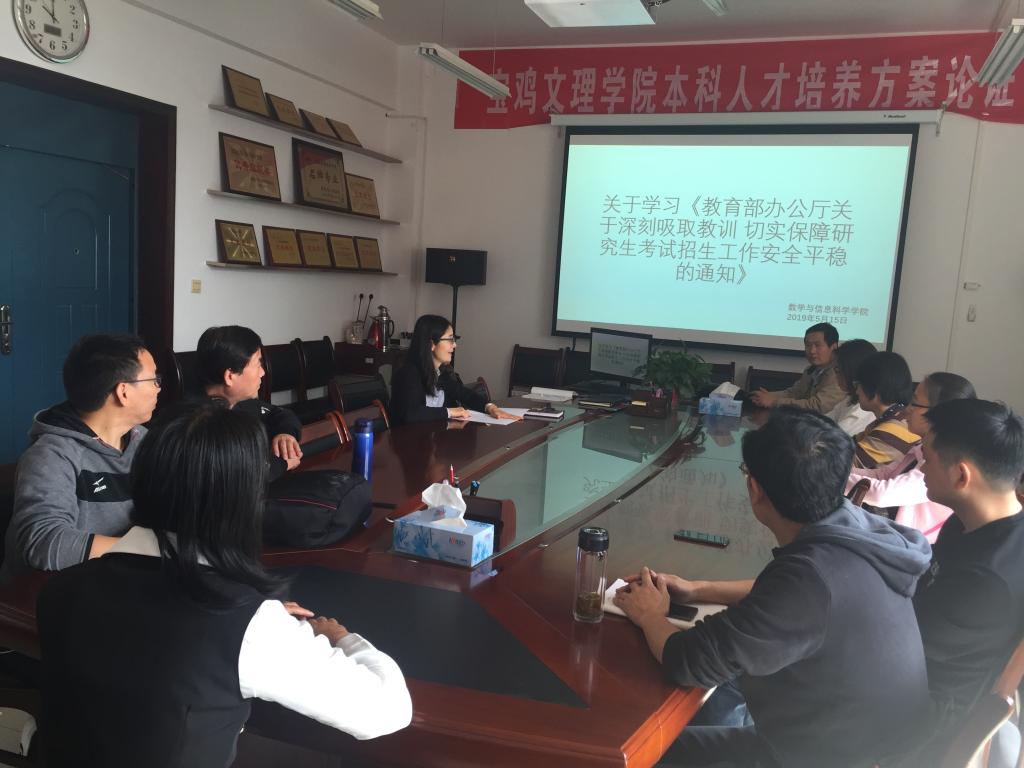 2019年5月15日上午10:00,数学与信息科学学院于思贤楼419会议室召开此次会议,认真学习“教育部办公厅关于深刻吸取教训切实保障研究生考试招生工作安全平稳的通知”。会议由学院科研副院长王爱丽主持,学院参与研究生考试招生工作的十位老师参加了本次会议。