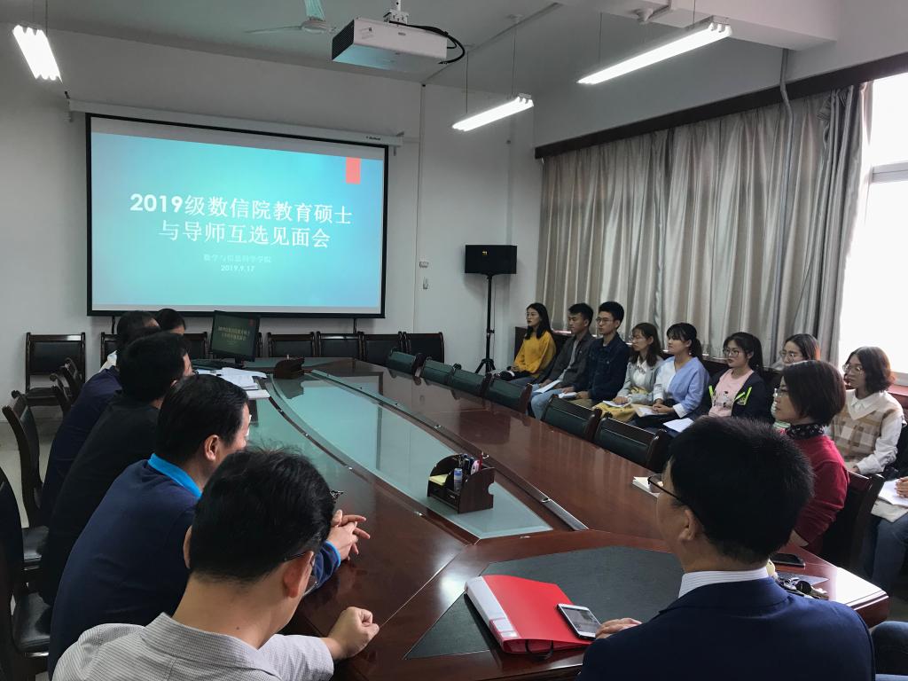 2019年9月17日下午与9月18日下午,数学与信息科学学院2019级教育硕士与学术型硕士分别进行了导师见面会并圆满完成了师生互选工作。本院书记郝满义、院长刘淳安、专硕与学硕导师及2019级硕士研究生参加了互选见面会,本次会议由副院长王爱丽主持。