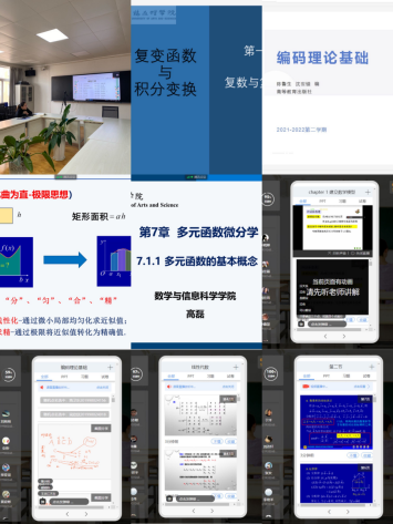 为有效防控新冠肺炎疫情,确保广大师生身心健康和生命安全,数学与信息科学学院根据上级通知精神和要求,结合学院实际,提前谋划,积极筹备,2022年1月16日数信学院顺利开展2021-2022学年第二学期线上课程教学,教学工作运行稳中有序。教师认真备课,利用雨课堂、腾讯会议等平台进行线上教学,学生认真听讲,师生互动良好。