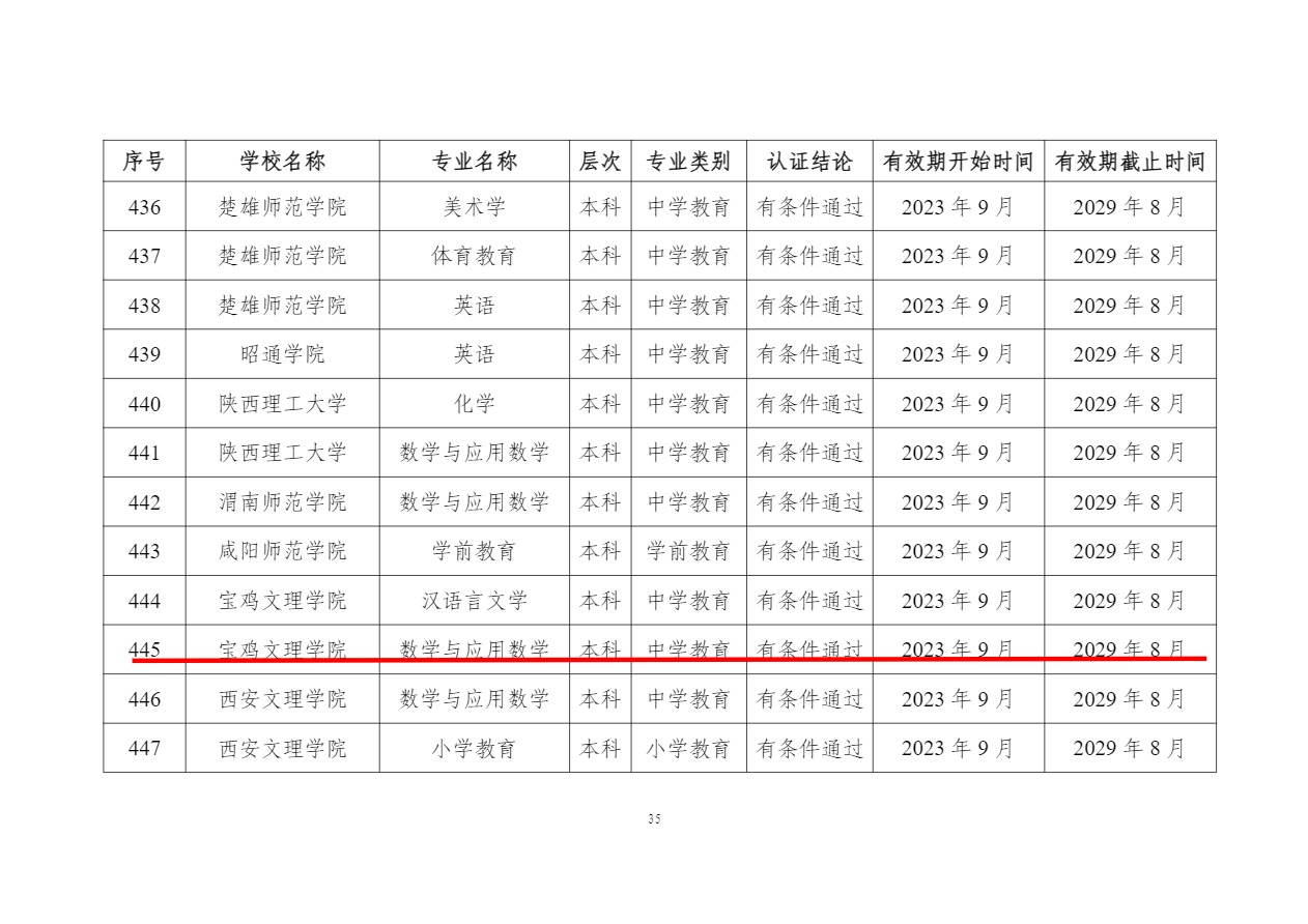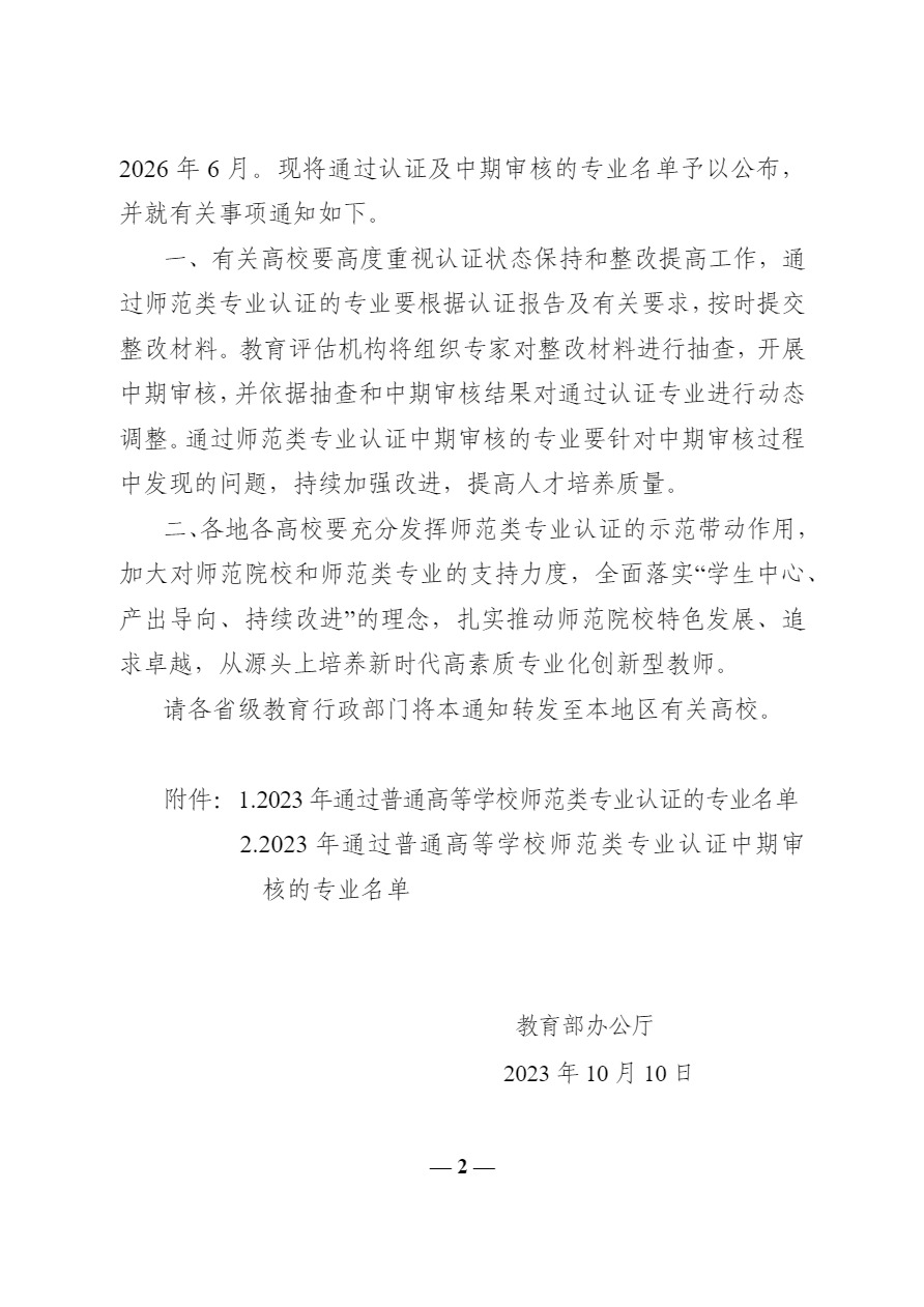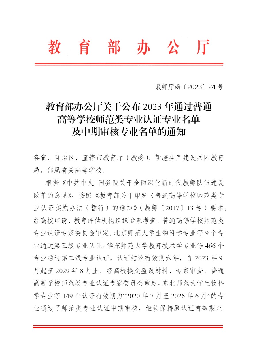 近日,教育部办公厅发布《关于公布2023年通过普通高等学校师范类专业认证专业名单及中期审核专业名单的通知》(教师厅函〔2023〕24号),我院数学与应用数学专业通过教育部师范类专业第二级认证,认证结论有效期六年(自2023年9月至2029年8月)。