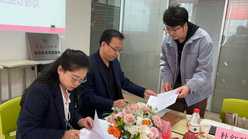 刘淳安与厉靖共同签署了《宝鸡文理学院劳动教育实践基地协议书》,并为学大教育授牌。(文/图张景瑞、审核/刘淳安)