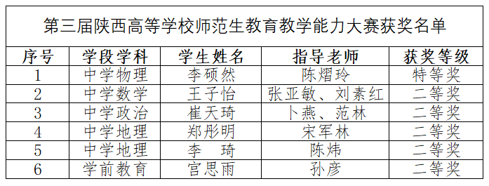近日,陕西省第三届高校师范生教育教学能力大赛结果公布,我院学生获得二等奖1项。