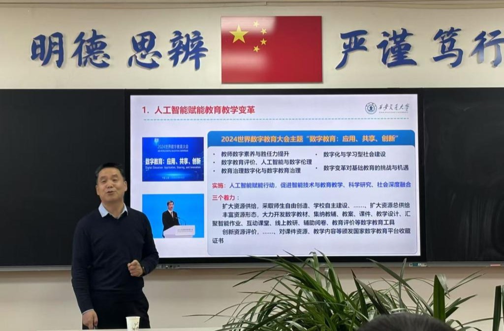 李继成教授的报告内容包含AI赋能教育教学变革、AI赋能教育教学的机遇和挑战、AI赋能教育教学的思考等三个部分。他指出人工智能大模型催生教学新模态、赋能教师发展、支持个性化学习、赋能课程建设、科学研究、教学方法和教学模式,强调教师需要不断学习并掌握新技术,从而更好地利用人工智能辅助教学,并指出了人工智能技术赋能教与学潜在的六大问题。在师生互动环节,李继成细心解答了师生的问题。