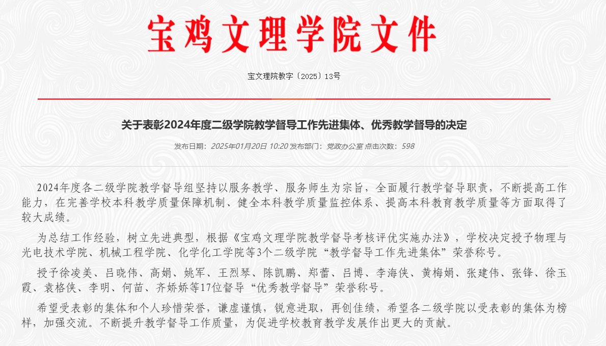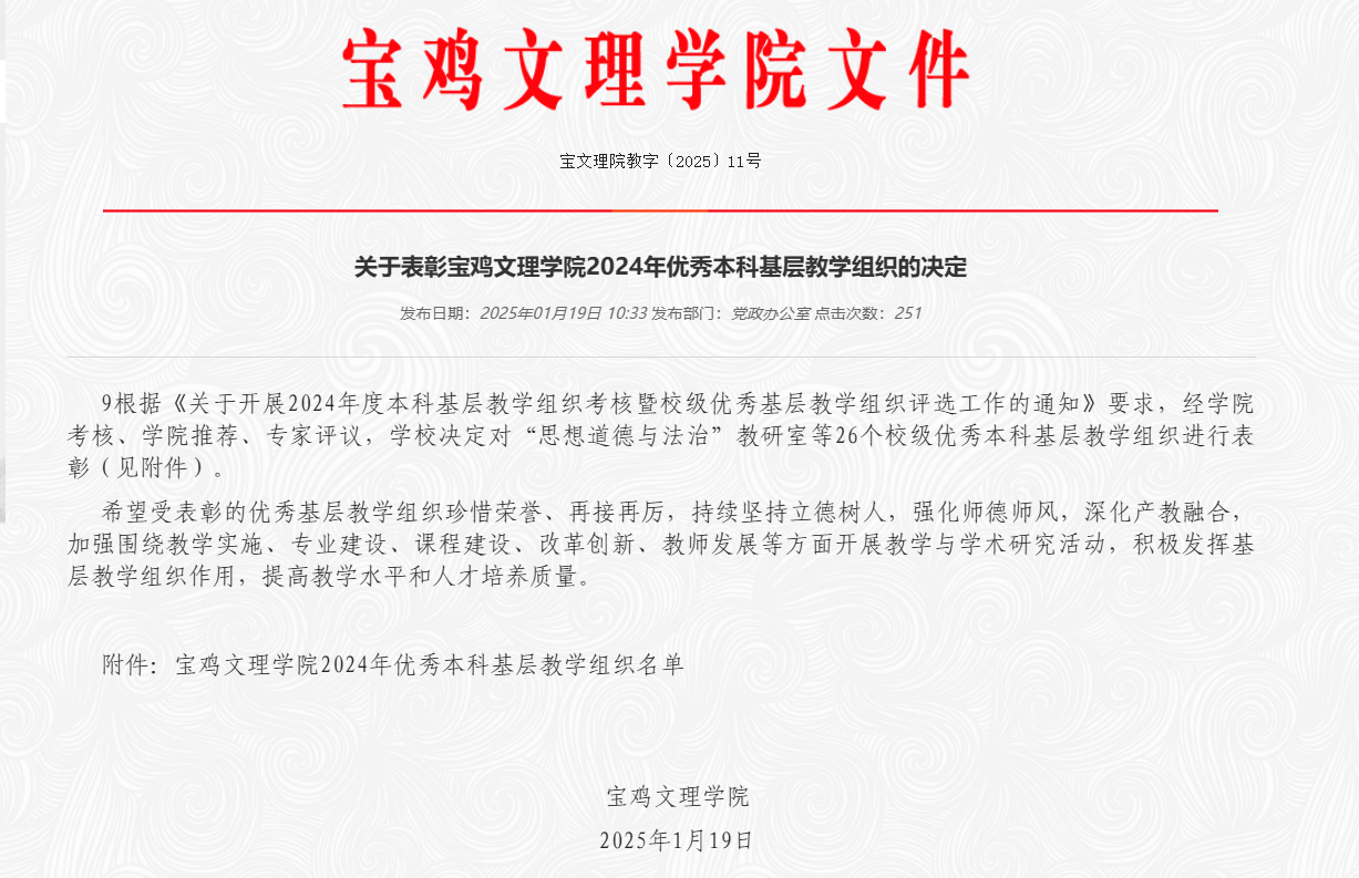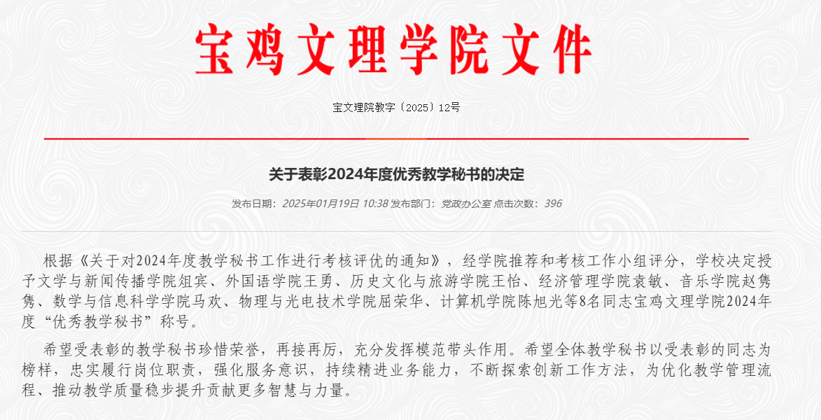 1月19日,根据《关于对2024年度教学秘书工作进行考核评优的通知》,经学院推荐和考核工作小组评分,我院马欢老师荣获宝鸡文理学院2024年度“优秀教学秘书”称号。