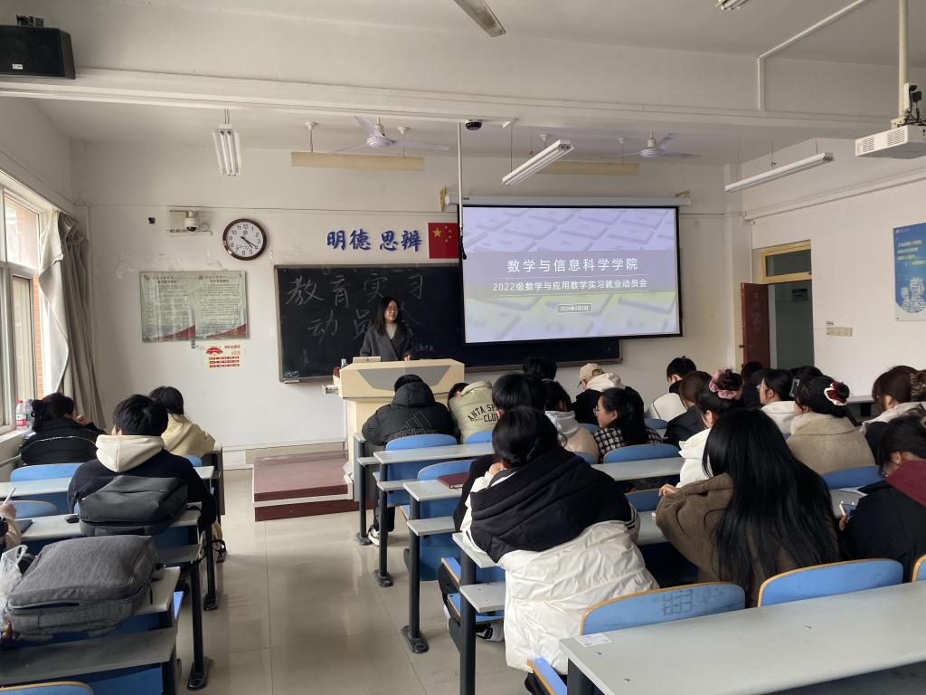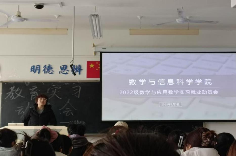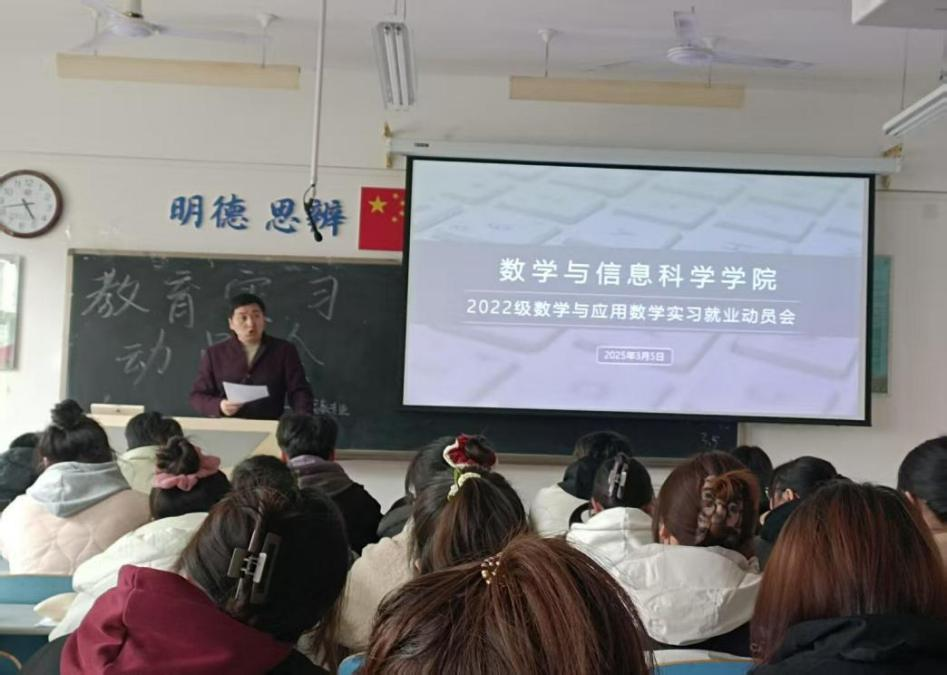 2025年3月5日,数学与信息科学学院于思贤楼426教室召开2025年教育实习动员大会。数信学院党委副书记王欢、副院长杜红珍、辅导员张景瑞,实习带队教师安海龙以及2022级数学与应用数学专业全体学生齐聚一堂,共同开启教育实习的重要篇章。