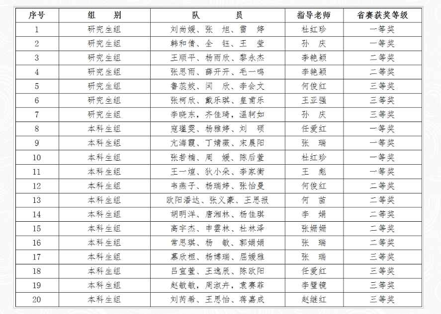 全国大学生统计建模大赛由中国统计教育学会主办,是《全国普通高校大学生竞赛排行榜》内的重要赛事之一。在教务处、研究生院的支持下,数学与信息科学学院选派具有丰富经验的教师组建指导团队,对参赛学生给予论文选题和论文写作等赛事指导。最终参赛团队以新颖的作品选题、科学的统计方法、严谨的内容设计取得了良好的比赛成绩。(教务处、研究生院、数学与信息科学学院 文/王亚强 审核/周喜华、王肖烨、刘淳安)