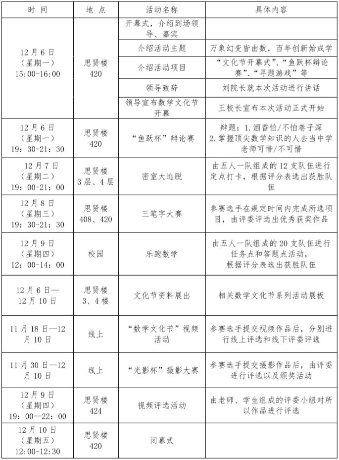 为大力弘扬数学文化,积极响应国家“大众创业,万众创新”的号召,进一步提升我校大学生的数学素养、创新意识和实践能力,在成功举办了三届数学文化节并取得丰硕成果的基础上,数学与信息科学学院认真贯彻落实学校关于“加强学科内涵建设”和“创新创业”的文件精神,以“数学文化”和“创新创业教育”为抓手,拟定于2021年12月6日至12月10日在高新校区举办宝鸡文理学院第四届数学文化节暨创新创业系列活动,以期通过本次活动在学校营造出良好的数学学习氛围,并展示数学与信息科学学院近几年专业建设的部分特色成果,进一步推动学院人才培养工作的高效和持续发展。本次活动以“万象幻变皆由数,百年创新始成学”为主题,主要分为11个板块,分别为“文化节开幕式”、“鱼跃杯辩论赛”、“寻题游戏”、“数字涂鸦”、“密室大逃脱”、“三笔字大赛”、“乐跑数学”、“文化节资料展出”、“视频活动”、“摄影大赛”、“文化节闭幕式”。