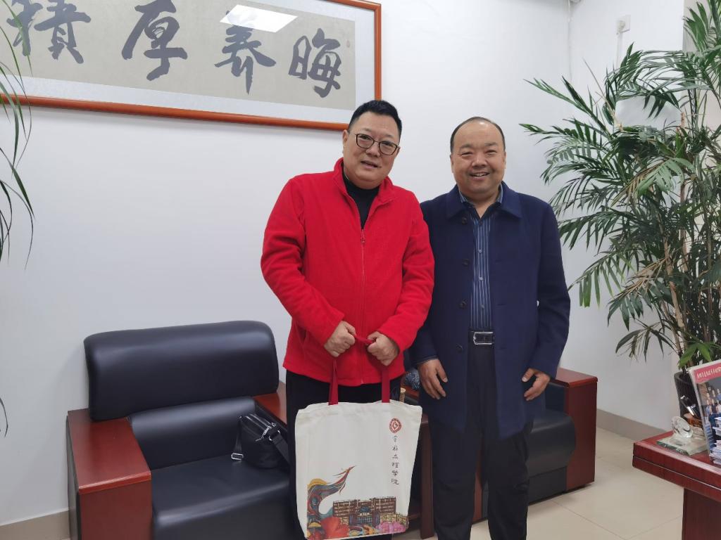 会前,校友工作处处长、校友总会秘书长刘景世与梁建斌进行座谈交流。